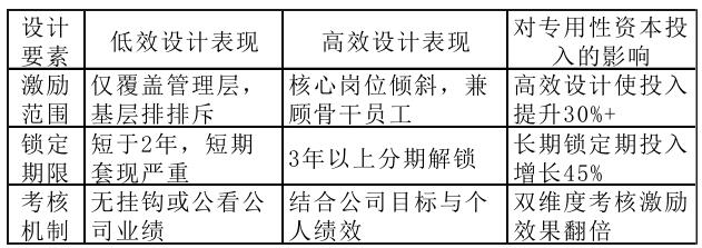 不同行业中三者关联强度存在显著差异,高科技行业对技能型劳动力依赖度高,专用性资本的“盈利非同步性”更强,员工持股计划的激励效应更显著;传统制造业则需侧重通过持股计划稳定技术骨干,减少专用性技艺流失。优化路径上,企业应采用“分类激励+动态考核”模式:对成熟业务骨干侧重长期锁定期股权,对创新业务团队匹配业绩股票;建立“招聘-培训-晋升”闭环,配合持股激励提升专用性资本留存率,同时平衡信息披露深度,降低投资者估值难度。