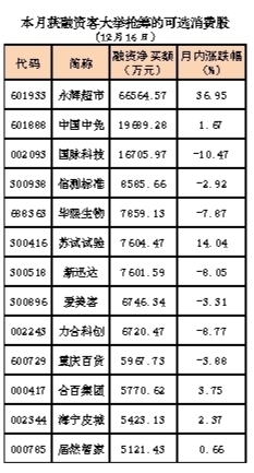 资金方面,数据显示,12月以来,共有57只可选消费股获得融资客青睐。其中,永辉超市月内获融资客大举抢筹约6.66亿元,中国中免、国脉科技融资净买额分别达1.97亿和1.67亿元,爱美客、重庆百货、居然智家等10股均获超5000万元融资净买入。