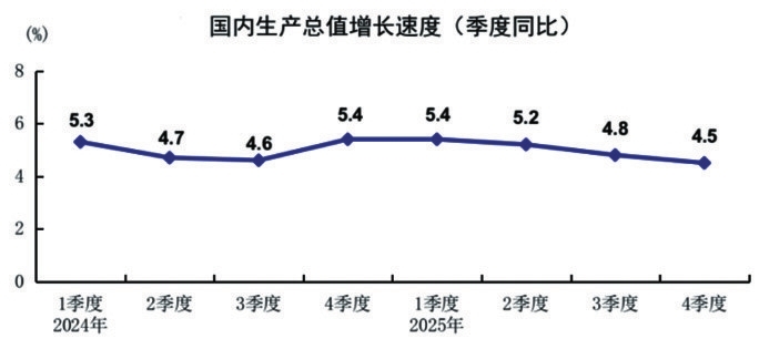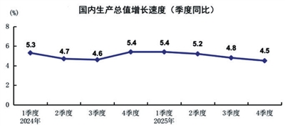 2025年,GDP同比增长5%。分季度看,一季度GDP同比增长5.4%,二季度增长5.2%,三季度增长4.8%,四季度增长4.5%。