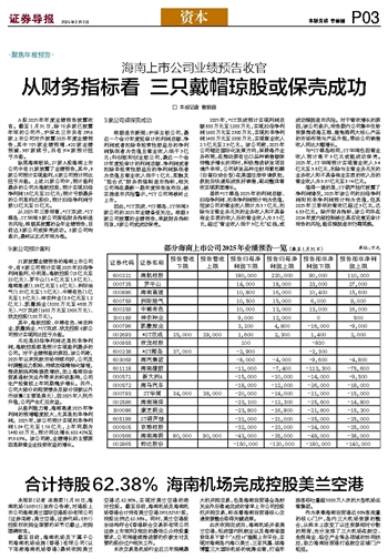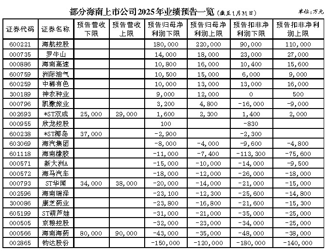 21家披露业绩预告的海南上市公司中,有9家公司预计实现2025年归母净利润盈利,分别是:海航控股(18亿元至22亿元)、罗牛山(1.4亿元至1.8亿元)、海南高速(1.08亿元至1.6亿元)、洲际油气(1.05亿元至1.5亿元)、中稀有色(1亿元至1.3亿元)、神农种业(0.9亿元至1.2亿元)、凯撒旅业(3200万元至4800万元)、*ST双成(1600万元至2300万元)、欣龙控股(100万元)。